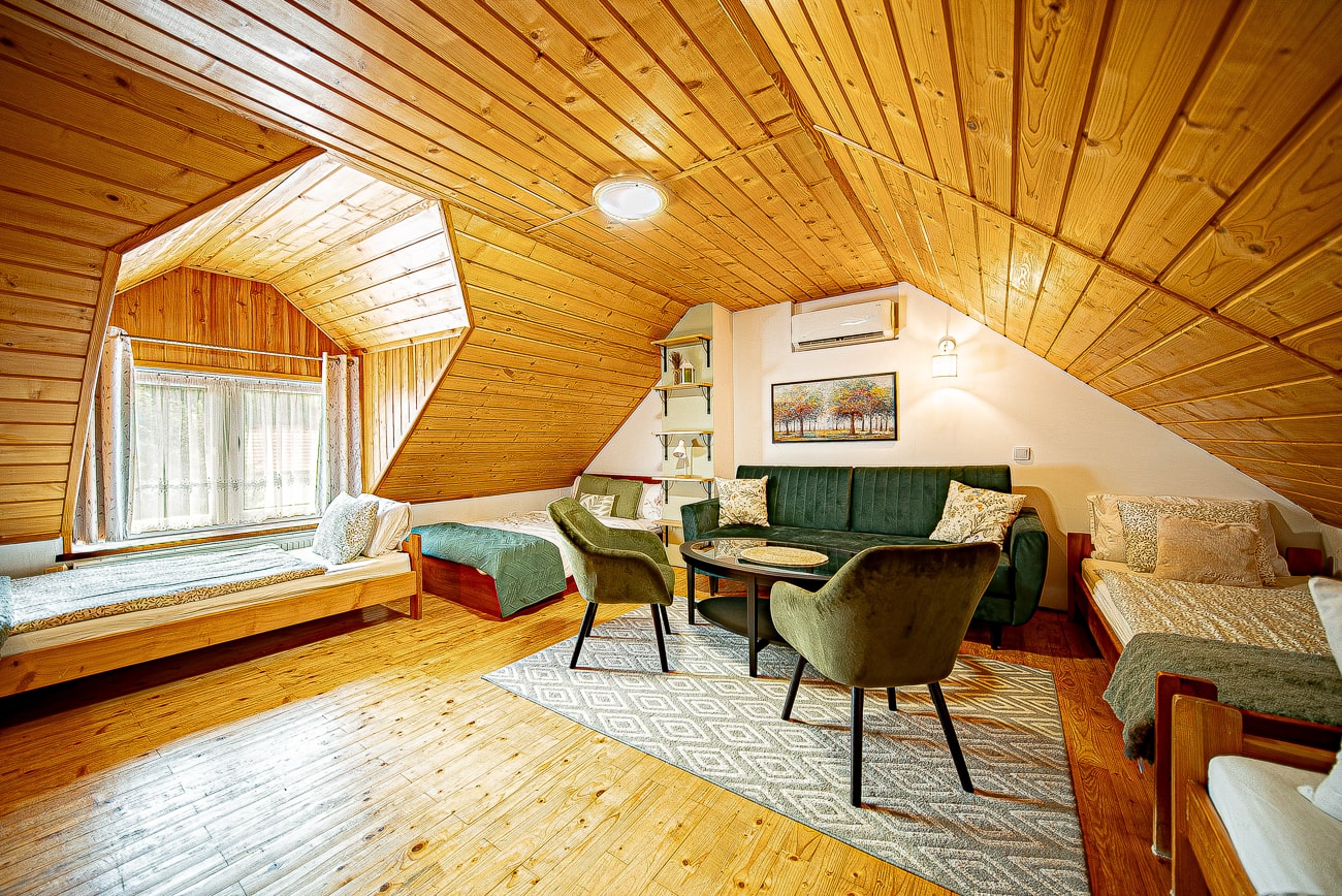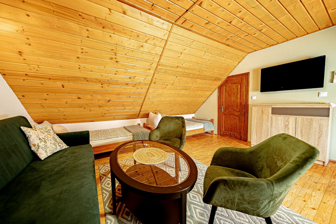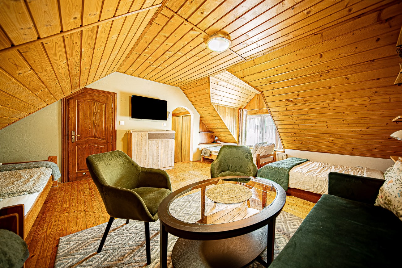 Przestronny i komfortowy pokój 5-osobowy, idealny dla rodzin lub grupy przyjaciół szukających spokojnego wypoczynku w kameralnej atmosferze.