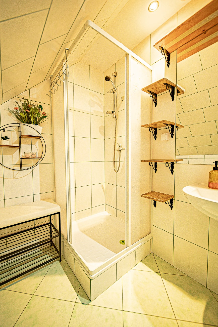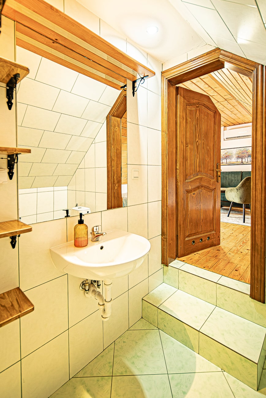 Każdy pokój posiada prywatną łazienkę z prysznicem, gwarantującą wygodę i pełną prywatność. Dodatkowo na piętrze znajduje się aneks kuchenny do dyspozycji gości, wyposażony w mikrofalę, zlew oraz niezbędne naczynia.